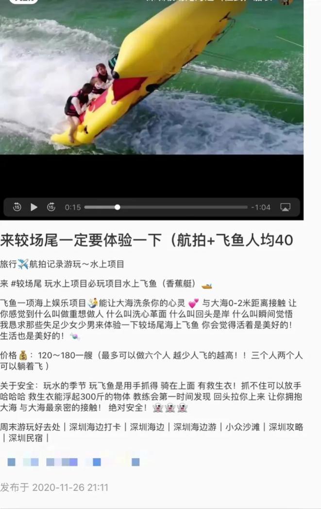 8月20日,一名22岁女孩在深圳大鹏新区较场尾海域游玩时身亡。据与其同行的朋友称,当晚他们玩的是一项名为“飞鱼”的项目。