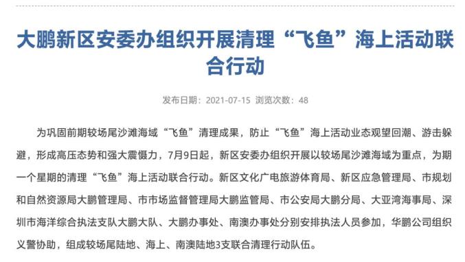 据媒体报道,当地政府7月曾发布《大鹏新区安委办组织开展清理“飞鱼”海上活动联合行动》。文章结尾表示:
