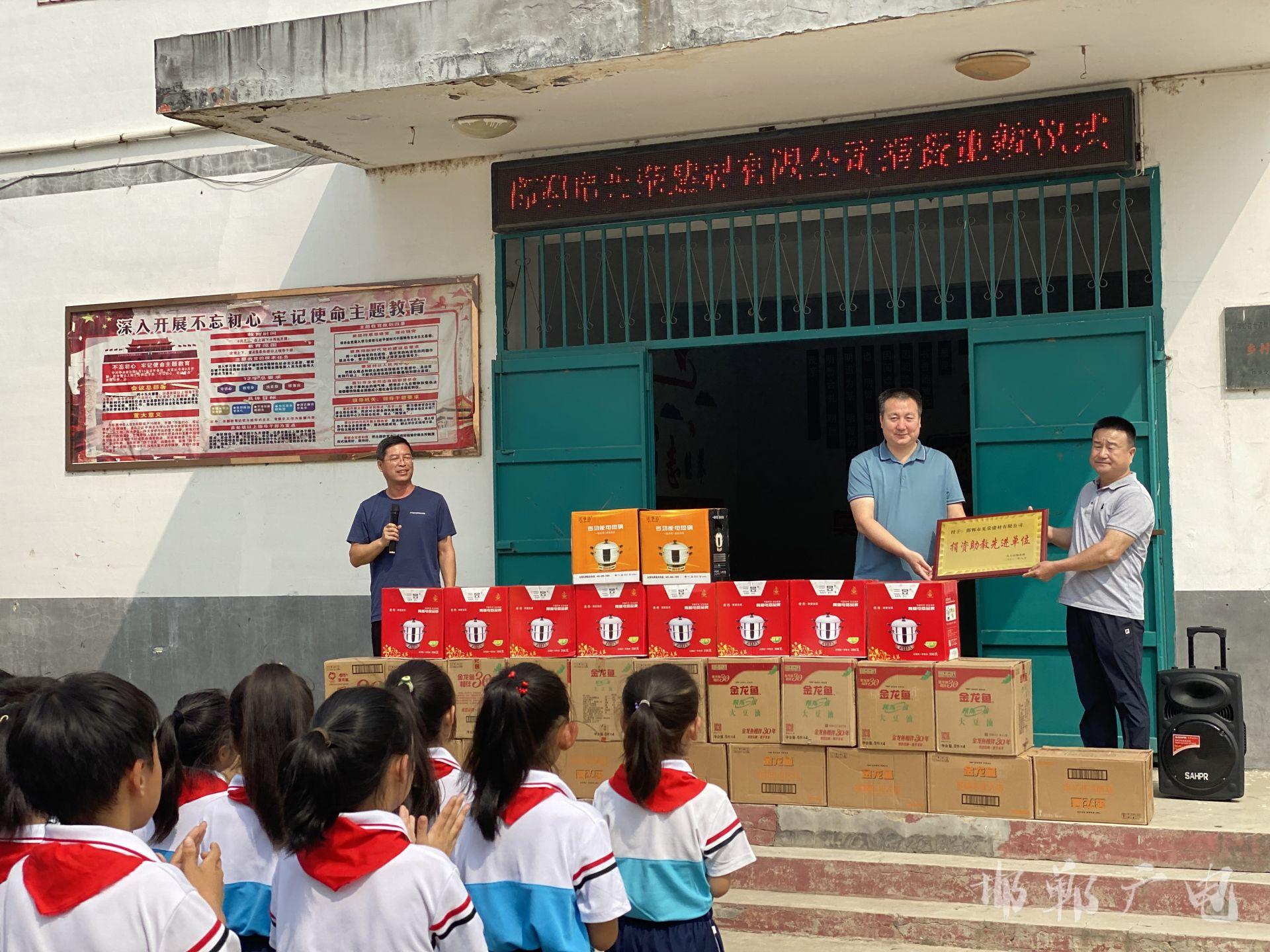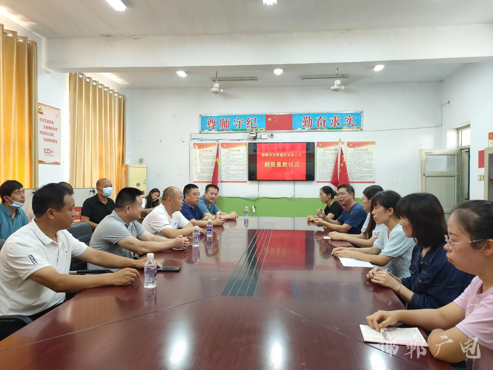 捐赠现场,镇政府一级主任科员赵彦庄、总校校长余卫校等热情地对爱心人士和企业的到来表示欢迎,对爱心人士和企业的慰问表示感谢,并现场为优秀教师一一颁发奖状和礼品。捐赠环节结束后,相关人员在会议室进行了亲切交谈,邯郸市光荣建材有限公司董事长宋认山讲到,少年强,则国强,只有少年们茁壮成长,国家才有希望,民族才有希望,少年们的成长需要优秀教师们常年的辛苦付出、细心培育。作为本地企业,公司能为教育出一份力是荣耀,更是责任,今后还将继续关心、支持教育事业,在自身发展的同时,始终牢记“饮水思泉、知恩图报”,积极回报社会。大油村党支部书记邢尚彬表示,今后村支两委将一如既往支持学校工作,做好教育事业的坚强后盾,把尊师重教的传统美德持续发扬下去。