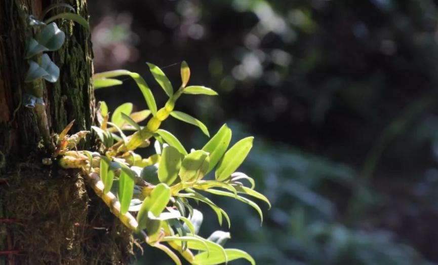 铁皮石斛依附在锥栗树的中层树干上,向下则是生机旺盛的多花黄精。在树上生长的铁皮石斛具有较强的抗逆性,不需要外加基质和营养,依靠吸收锥栗树皮和树干的营养就能很好生长。