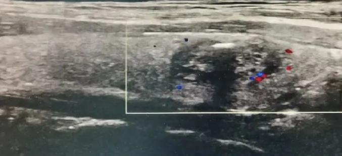 今年,小丽在入职体检时发现结节变大了。B超提示,结节大小1.2cm,形态不规则、直立状,内见沙粒样钙化,可见短棒状血流。