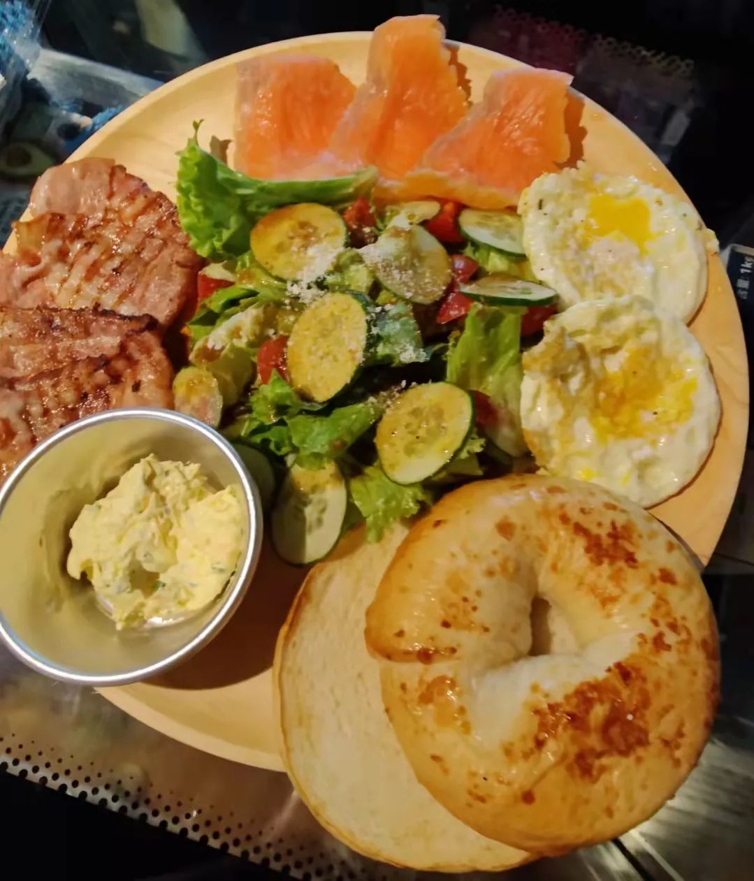 Paradiso的贝果,有罗勒鸡肉、三文鱼、培根鸡蛋、火腿牛油果、烤蔬菜等不同口味可供选择,套餐还包含煎蛋和酱可自由搭配,十分丰富。早午餐来一顿,开启美好有活力的一天。