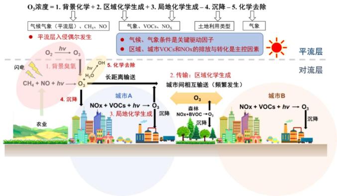 环境空气中的O3浓度受到背景值、区域和局地化学生成、沉降以及化学去除的综合影响,攻关研究结果表明,O3污染的形成可以从前体物排放、化学转化、气象影响和三维传输等方面进行解析。