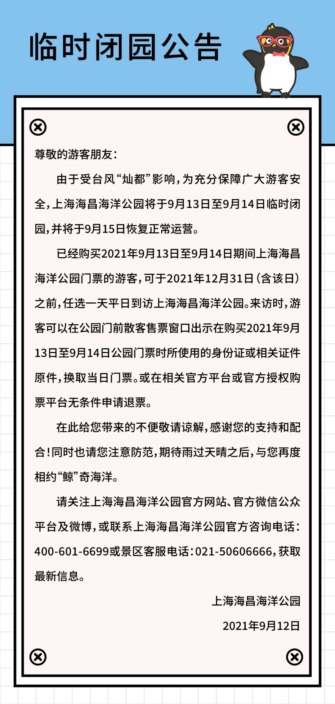 因受第14号台风“灿都”影响,为保障游客出行安全,锦江乐园及锦江乐园夜市将于2021年9月13日(周一)至14日(周二)闭园/闭市。