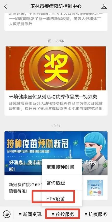 1.关注“玉林市疾病预防控制中心”微信公众号,在“疾控服务”选择“HPV疫苗预约”。