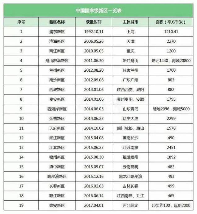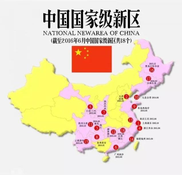 先看北上广深,截止目前北京没有,上海浦东新区,广州南沙新区。再看直辖市,天津滨海新区,重庆两江新区。再看沿海几个省市,浙江舟山群岛新区,山东青岛西海岸新区,江苏南京江北新区,福建福州新区,辽宁大连金普新区。再往东北看,黑龙江哈尔滨新区,吉林长春新区。再往内陆看,江西赣江新区,湖南湘江新区,云南滇中新区,甘肃兰州新区,陕西西咸新区,贵州贵安新区,四川天府新区。最后是千年大计河北雄安新区。