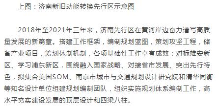 山东新旧动能转换综合试验区中涉及的济南部分是,“济南:实施北跨东延、携河发展,在黄河沿岸高起点、高标准、高水平规划建设济南新旧动能转换先行区,建设现代绿色智慧新城。”具体来说,先行区总面积1030平方公里,南起小清河、北至徒骇河、东至章丘、西至齐河。初步规划面积798平方公里。