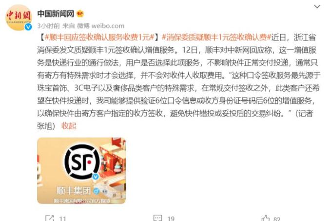 近日,浙江省浙江省消保委微信公众号发文,称有消费者向其反映,在使用“顺丰速运+”微信公众号寄快递时,发现顺丰公司提供了一项名称为“签收确认”的收费增值服务,收费金额为1元,购买该项增值服务后,收件人需凭顺丰发送的签收码或本人身份证后6位签收快递,消费者认为顺丰提供该项增值服务的行为侵害了其合法权益。