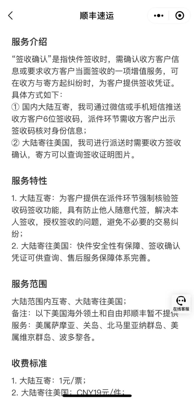 有消费者在在使用“顺丰速运+”微信公众号寄快递时,发现顺丰公司提供了一项名称为“签收确认”的收费增值服务,收费金额为1元,购买该项增值服务后,收件人需凭顺丰发送的签收码或本人身份证后6位签收快递。