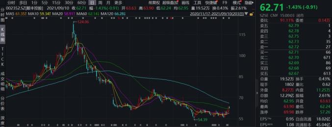 和顺丰业绩相匹配的,顺丰的股价也在今年遭遇滑铁卢。自今年2月中旬创下124.06元/股的历史新高后,顺丰股价一路下挫,最低跌至54.39元/股,跌幅近60%。目前,顺丰控股报62.71元/股,总市值2857亿元。