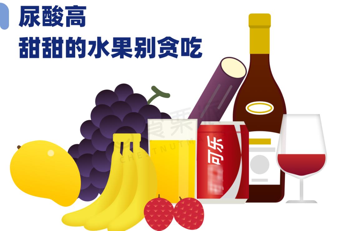 除了饮料、糕点中加的糖浆、蜂蜜之外,水果也是果糖的来源之一。所以尿酸高的人吃水果也要适量,尤其是荔枝、芒果等糖分高的水果;果汁更是不建议喝。