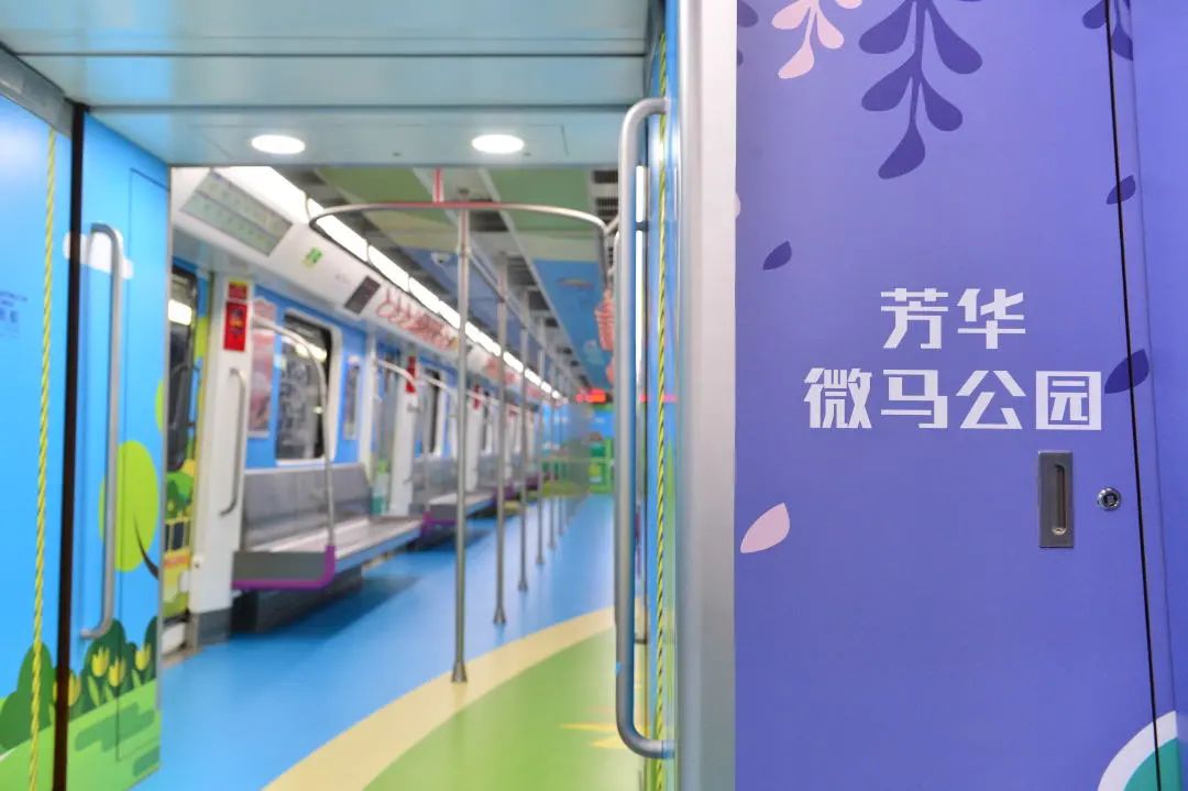 “手绘+实景”,颜色清新雅致,“香城号”主题列车车厢内部,以新都区乡村振兴代表项目“珠链锦绣”为主题,囊括芳华微马公园“浪漫紫藤”场景、夏河溪乡野公园“绿色自然”场景等六大场景。