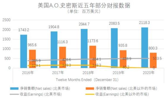 (数据根据A.O.史密斯财报整理,“北美以外的市场”的数据中以中国市场占比最大。)