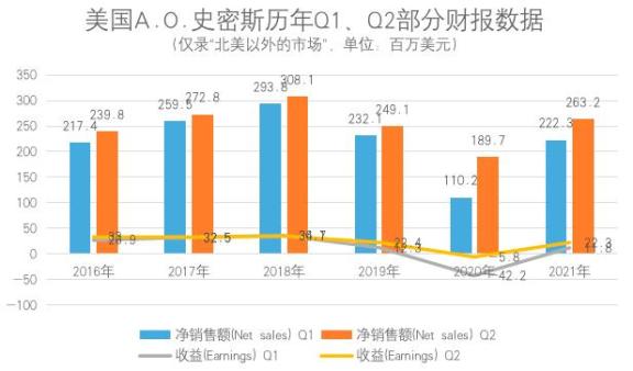 或许是因为2018年以来的业绩下滑,2020年2月,A.O.史密斯突然宣布免去主持中国业务逾20年的丁威,改任同样具有研发工程师背景和将近20年司龄的邱步为中国区负责人。目前,还看不出这一举措是否有力挽狂澜的作用。据其最新财报,2021年Q1和Q2的净销售额和收益均比去年大幅增加,但也不过回到了2019年的位置附近。