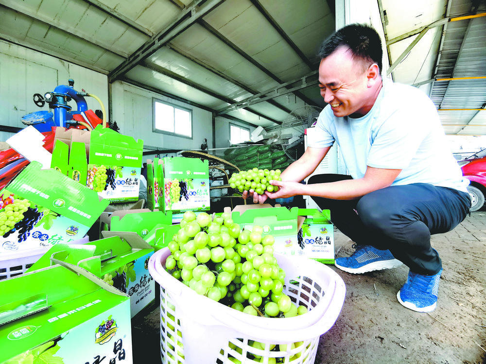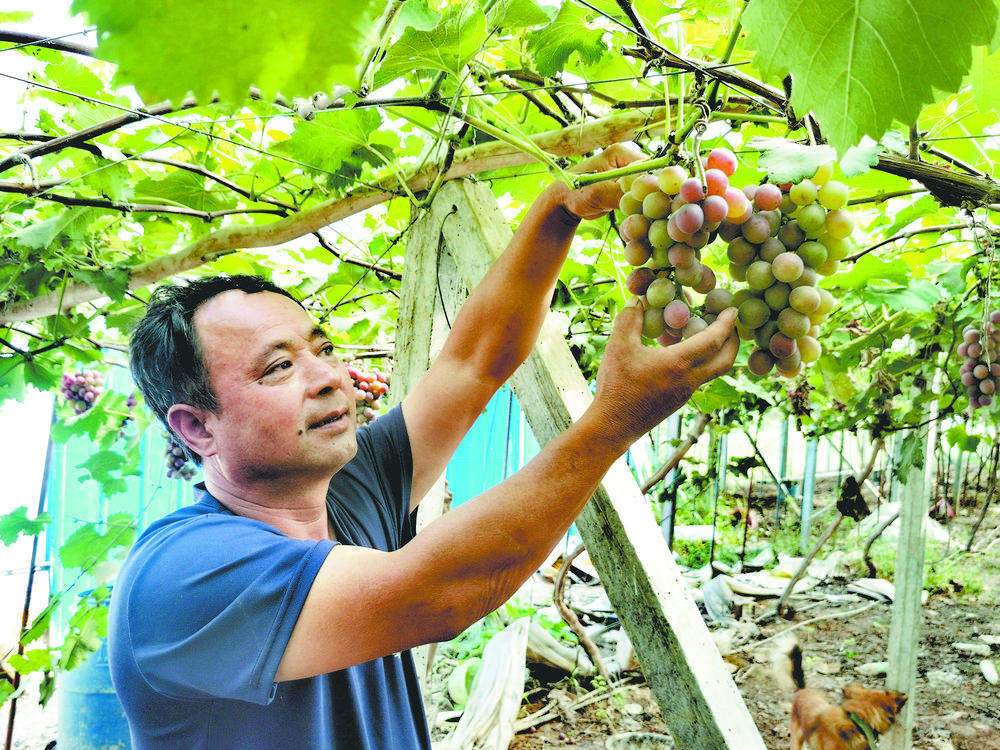 离村口不远,是社员郑俊亮的葡萄园。这里,果味飘香,亲朋好友正忙着帮他采摘葡萄,一派热闹景象。“等装好箱,这些葡萄马上就会被拉走。今年遇到好年景,我种植的葡萄能带来40万元的纯收入。这要搁以前, 这么好的事咱想都不敢想啊!”今年43岁的郑俊亮身体残疾,过去单靠种植传统作物,日子过得紧巴巴,在镇村干部的帮助下,他种植了40亩葡萄,今年也迎来了大丰收。
