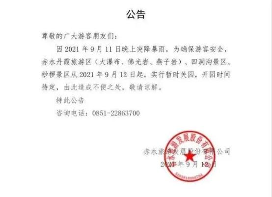 因9月11日晚间突降暴雨,为确保游客安全,赤水丹霞旅游区(大瀑布、佛光岩、燕子岩)、四洞沟景区、桫椤景区从9月12日起,实行暂时关园,开园时间待定。具体公告如下: