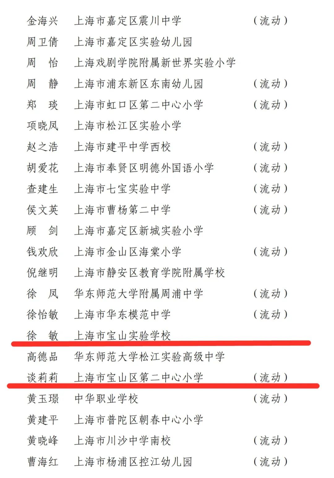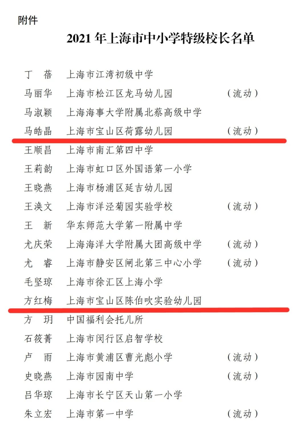 经上海市中小学校长职级专家评审委员会评审,上海市教师专业发展工程领导小组公示及审定,全市99名同志具备中小学(幼儿园)和中职校特级校(园)长职级资格(含书记对应特级校长职级资格)(可点击“阅读原文”查阅),任职资格从2020年12月起计算。其中,上海市行知中学杨卫红、上海市宝山实验学校徐敏、上海市宝山区第二中心小学谈莉莉、上海市宝山区陈伯吹实验幼儿园方红梅、上海市宝山区荷露幼儿园马皓晶共5名宝山校(园)长榜上有名。一起来看具体名单: