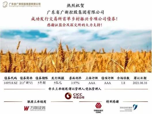 2021年6月,万联证券助力广东企业成功发行全国首单交易所乡村振兴专项公司债券,发行规模5亿元。该项目所募集资金将投入养猪场现代化建设项目,辐射带动项目周边乡村振兴事业。万联证券及时总结“首单”经验,接续发扬“首单”精神,于2021年8月,再次以牵头主承销商和簿记管理人身份,助力广州企业成功发行广州市首单乡村振兴专项公司债券,发行规模2亿元,募集资金将专项用于麦村乡村振兴建设领域,助力打造新型农业生产示范基地,加快推进农业现代化和乡村振兴步伐。