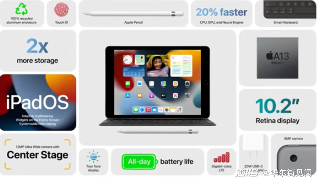 苹果还推出了新款入门级平板电脑iPad,搭载升级后的A13芯片,运行速度较老版的A12芯片提升20%,12兆像素前值摄像头将提升Zoom和FaceTime等视频通话画质,并有LTE无线连接。