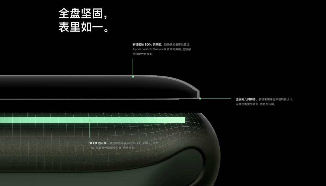 值得一提的是,这次苹果还把手表表面的玻璃增厚了 50% ,最厚的地方达到了 6 代的两倍,并通过了 IP6X 的防尘认证和 WR50 的 50 米防水认证。