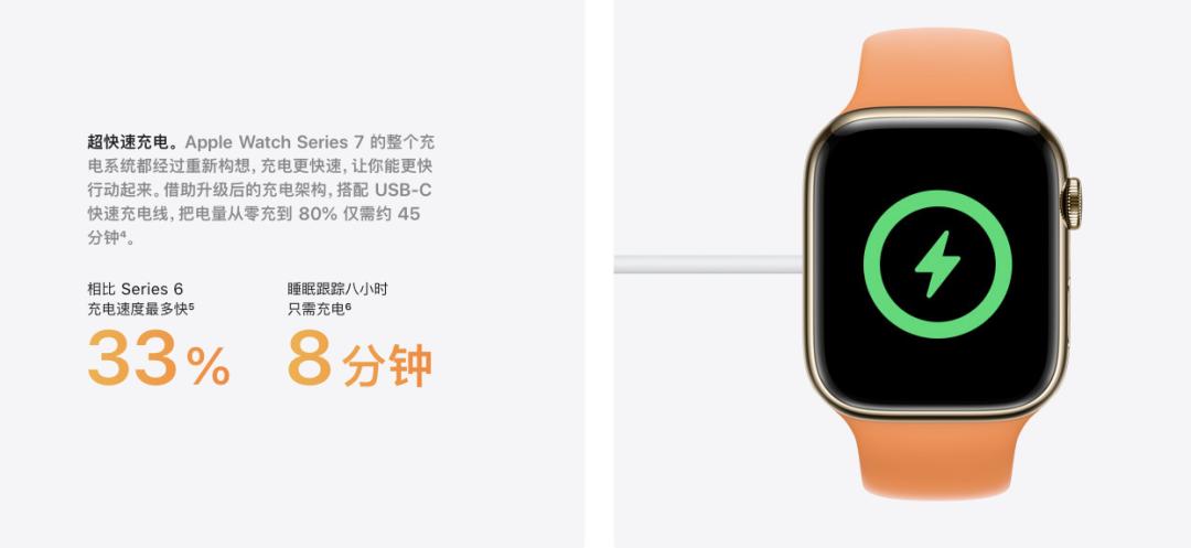 而这次的 Apple Watch Series 7 最大的改变,应该就是把充电器的 USB-A 换成了 USB-C ,充电速度相比 6 代提升了 33% ,续航依旧是祖传的 18 小时。。。