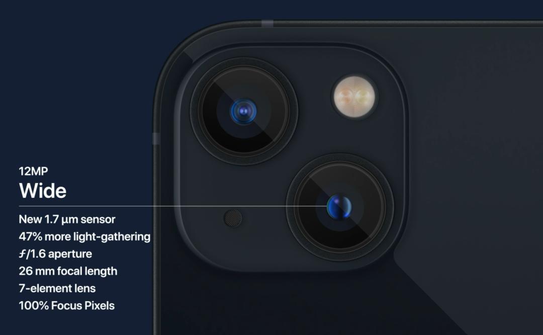 iPhone 13 系列的两款机型都升级了更大的感光元件,首先是苹果将原先那颗 26mm 的广角主摄,升级到了 1.7 μ m 的传感器,这款镜头的进光量相比 iPhone12 提升了 47% ,并有效减少了画面噪点。