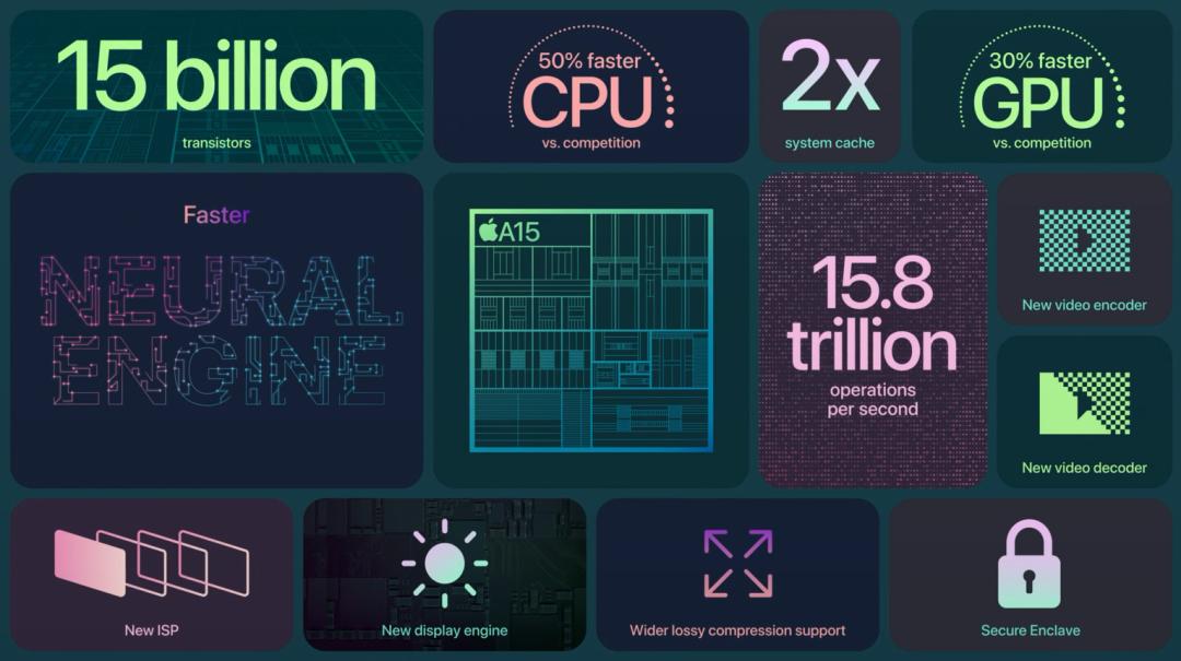 iPhone 13 系列搭载了全新的A15 仿生芯片,采用 5nm 制程,新增了显示引擎,视频编码解码单元。