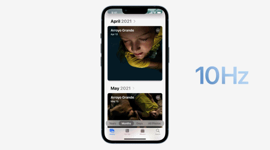 iPhone 13 Pro 和 13 Pro Max 用上了最高120Hz 的 ProMotion 自适应刷新率,可以在 10Hz 到 120Hz 之间变动,并且峰值亮度可以达到 1000 尼特。