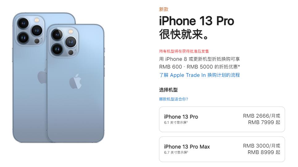 iPhone 13 Pro 售价7999 元起, iPhone 13 Pro Max 8999 元起,同样是加量不加价。