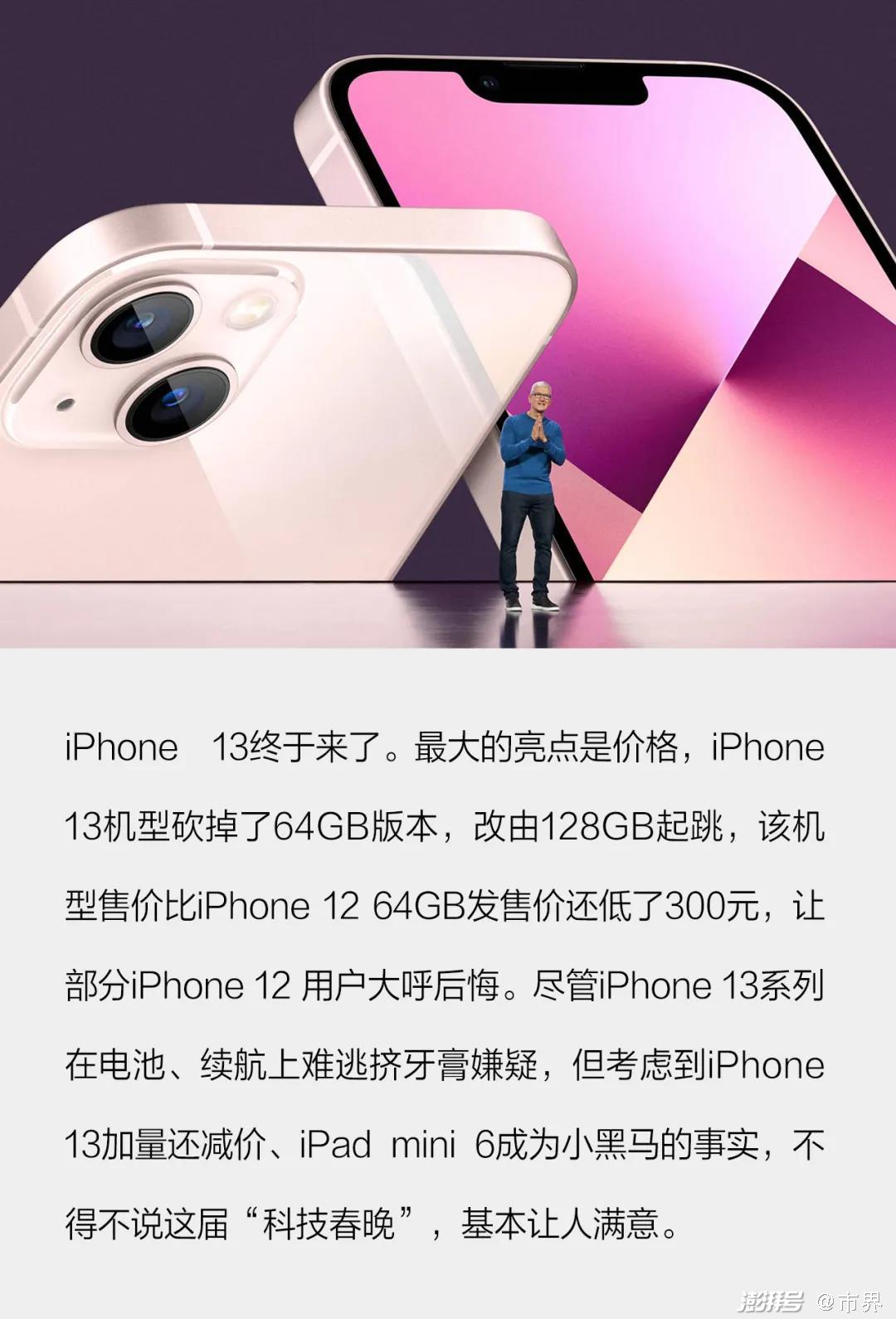 尽管iPhone 13系列在电池、续航上难逃挤牙膏嫌疑,但考虑到iPhone 13加量还减价、iPad mini 6成为小黑马的事实,不得不说这届“科技春晚”,基本让人满意。