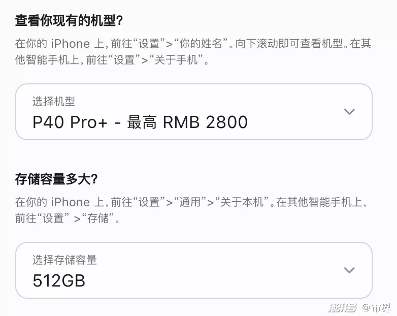 不仅如此,苹果这次贴心推出了包括华为、小米、OPPO部分机型在内的“旧机换购”计划。华为P40、Mate 30系列、OPPO Reno 5系列、小米10系列赫然在换购列表中。华为P40 Pro+ 512GB最高可折抵2800元,这样算下来,最低花费3199元就可把iPhone 13带回家。