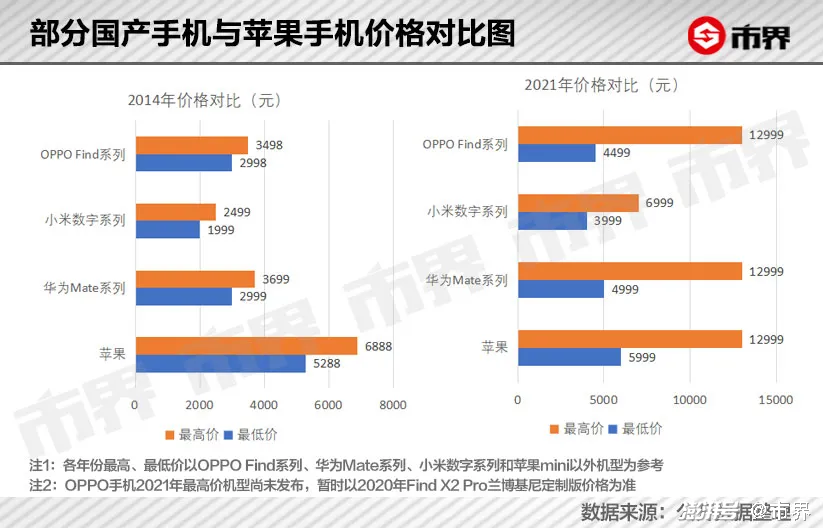 再看2021年的价位,华为、小米和OPPO的高端系列起售价已经来到了3999元至4999元的位置,距离苹果今年新机的起售价5999元接近了许多,最高价方面已经有两家跑到了12999元的位置,和苹果齐头并进。