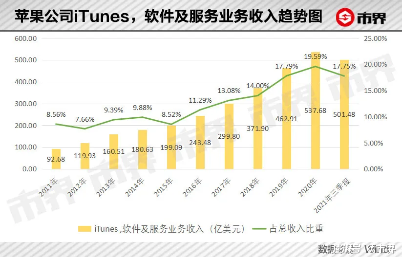 从财报数据来看,2012年以来,iTunes、软件及服务业务为苹果带来的业务收入从120亿美元增至2020年的538亿美元,占总收入比重从7.66%提高到19.59%。