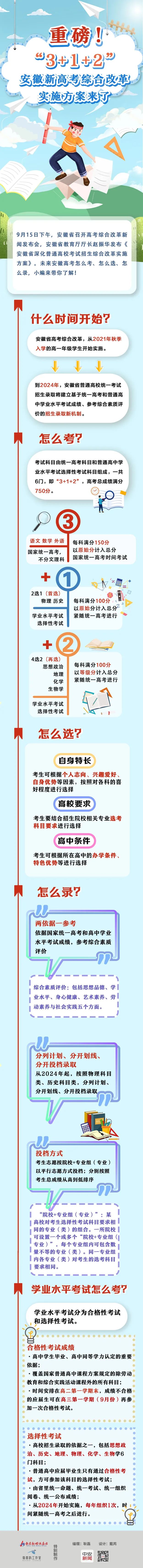 方案研制过程中,我省组织开展了深入系统调研,通过召开系列座谈会、开展问卷调查等,广泛征求省人大、省政协,市、县(市、区)教育行政部门、考试机构、教研机构、本专科高校、普通高中、中职学校等部门、学校,以及有关专家和学生、家长等各方面的意见,重点围绕选课走班、考试科目设置、等级赋分等重点难点问题开展专题研究,经过不懈攻关,先后经过60余次专题会议研究,制定了《安徽省深化普通高校考试招生综合改革实施方案》(以下简称《实施方案》),开展专家论证、风险评估、合法合规性审查,经省政府常务会审议通过,报省委审定,由省政府报教育部备案批复后,正式印发执行。