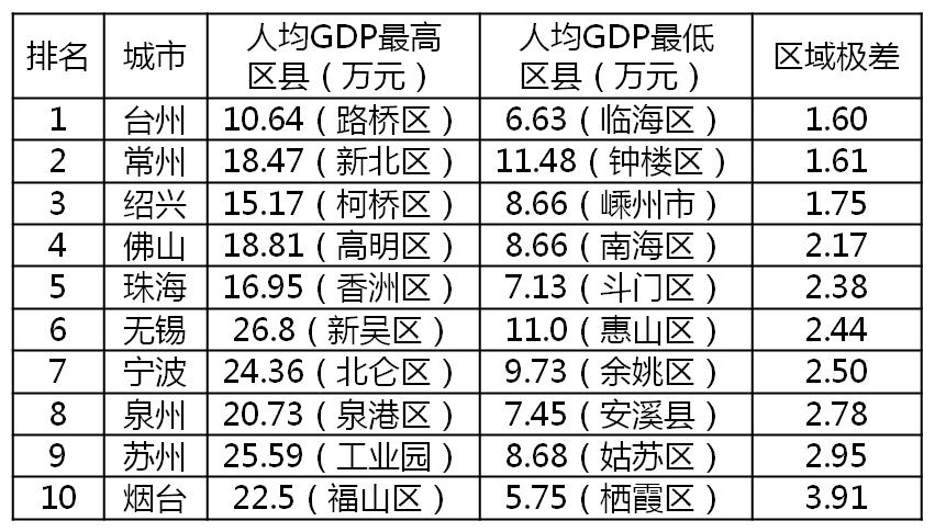 区域最均衡的是台州,区域极差仅1.60。紧随其后的是常州,常州是全城富裕,所有区人均GDP都超过全国水平。绍兴民营经济发达,各个区县都很繁荣,且发展均衡。