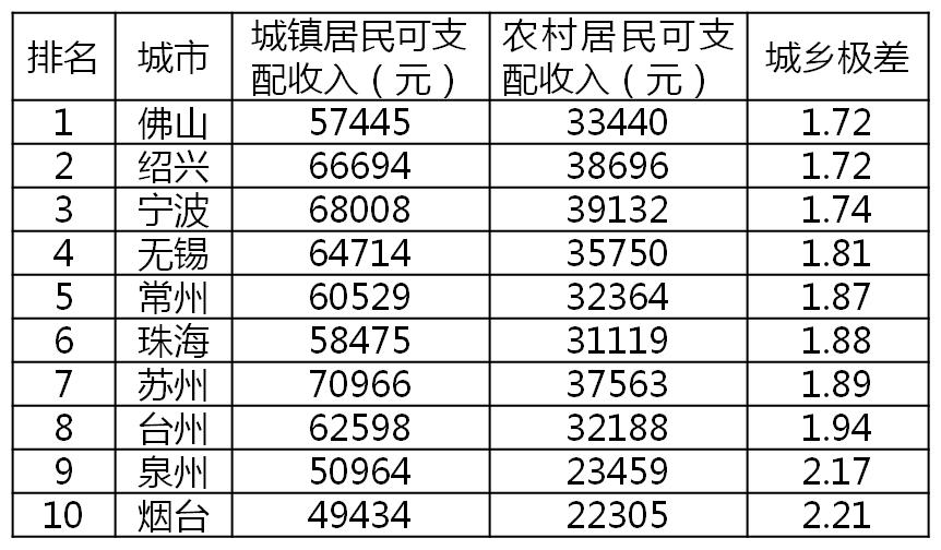 佛山在十大共富城市中,城乡差距最小。