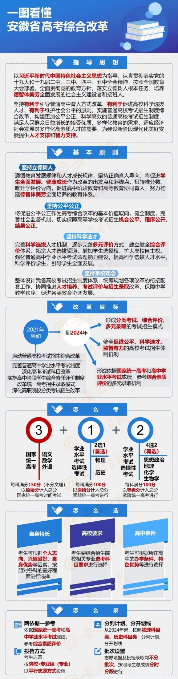 记者从省政府新闻办9月15日召开的“安徽省深化高等学校考试招生综合改革实施方案”新闻发布会上了解到,我省今年秋季学期起启动实施的高考综合改革实行“3+1+2”模式。自2024年起,普通高等学校招生实行统一高考和普通高中于业水平考试相结合,参考普通高中学生综合素质评价的录取模式。