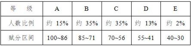 等级赋分:对于某一再选科目,考生该科目的合格性考试成绩达到合格后,转换时赋分起点为 30 分,满分为 100 分。按照选择性考试科目考生的原始分从高到低划定A、B、C、D、E共5个等级,各等级人数所占比例分别约为15%、35%、35%、13%和2%。将A至E五个等级内的考生原始分,依照等比例转换原则,分别对应转换到100~86、85~71、70~56、55~41和40~30五个分数区间,得到考生的等级分。