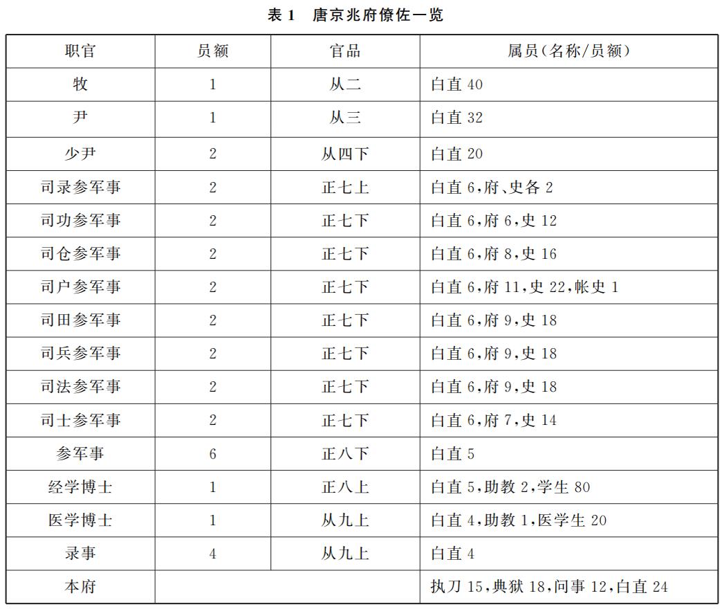 关于京畿区的长官及僚佐配置,在京兆府层面,唐初以亲王出任京兆牧,后不常置,京兆尹实为京畿区最高行政长官;尹之下置少尹,司录、录事及诸曹参军,经学、医学博士等,皆为品官。司录及诸判司配有若干名府、史,无品,身份为杂任,另天宝之前配有白直;在府内执役,供官司驱使的还有执刀、典狱、问事、白直等吏人,无品,身份为杂职。详参表1。