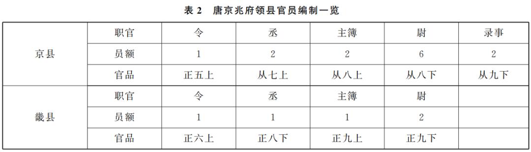 县是京兆府之下的一级行政机构,是唐廷实现京畿管理、控制百姓的关键所在。据《唐六典》载唐前期制度,万年、长安两京县的流内品官有令、丞、主簿、尉、录事,依历代京城六部尉之制,县尉多达6名;而诸畿县品官仅令、丞、主簿、尉,员额亦较京县为少,尉仅2名(详表2)。与京兆府的情况对接,县下分曹(功、仓、兵、户、法等)置佐、史,佐、史无品,与市令等并为杂任;在县内执役者,尚有典狱、问事、白直若干名,身份为杂职。