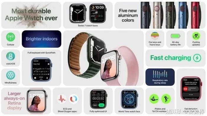 另一款硬件Apple Watch Series 7,也在此次发布会推出。与前代产品不同的是,Apple Watch Series 7 是苹果手表发售七年来首次大改屏幕,有着更高的屏占比,比上代增大了 20%,屏幕变宽比上代收窄40%,最高亮度提升70%。随着屏幕面积的增加,UI及表盘也随之变化,文字内容比上代多显示50%。