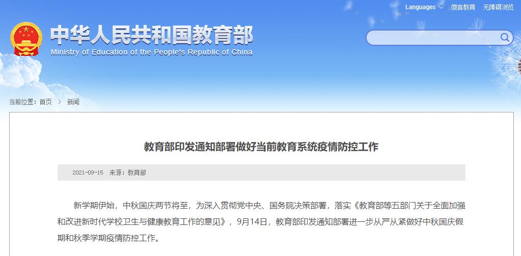 教育部:中秋国庆假期鼓励广大师生就地过节。针对即将到来的中秋和国庆假期,教育部通知要求各地教育部门和学校要从严落实校园疫情防控措施,持续完善应急处置机制,认真做好中秋国庆假期疫情防控和留校师生服务保障工作。