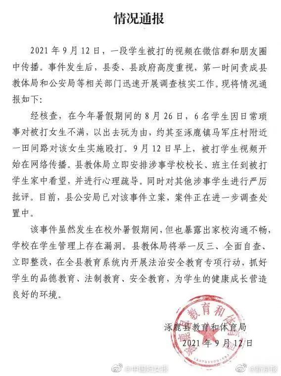 原标题:《青年早餐 | 河北涿鹿6名学生围殴1名女生,警方已立案调查〔2021.9.16〕》
