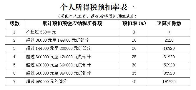 上述公式中的预扣率、速算扣除数,按照2018年第61号公告所附的《个人所得税预扣率表一》执行,如下: