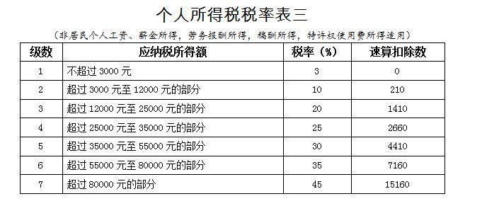 非居民个人的工资、薪金所得,以每月收入额减除费用五千元后的余额为应纳税所得额;劳务报酬所得、稿酬所得、特许权使用费所得,以每次收入额为应纳税所得额,适用个人所得税税率表三计算应纳税额。劳务报酬所得、稿酬所得、特许权使用费所得以收入减除百分之二十的费用后的余额为收入额;其中,稿酬所得的收入额减按百分之七十计算。