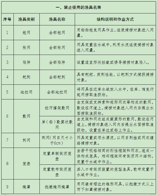 重庆市禁捕水域禁止使用的渔具和捕捞方法名录