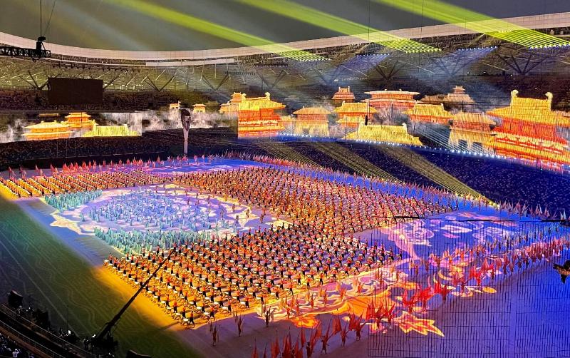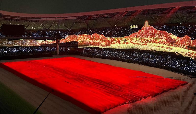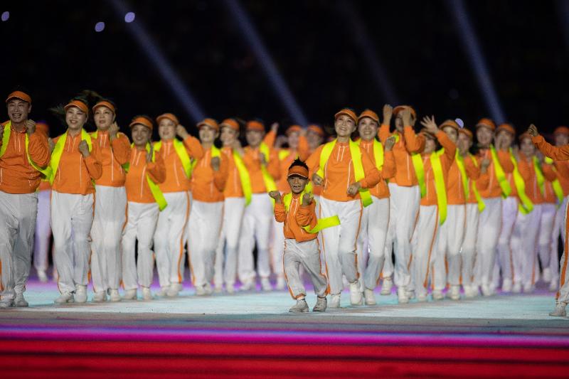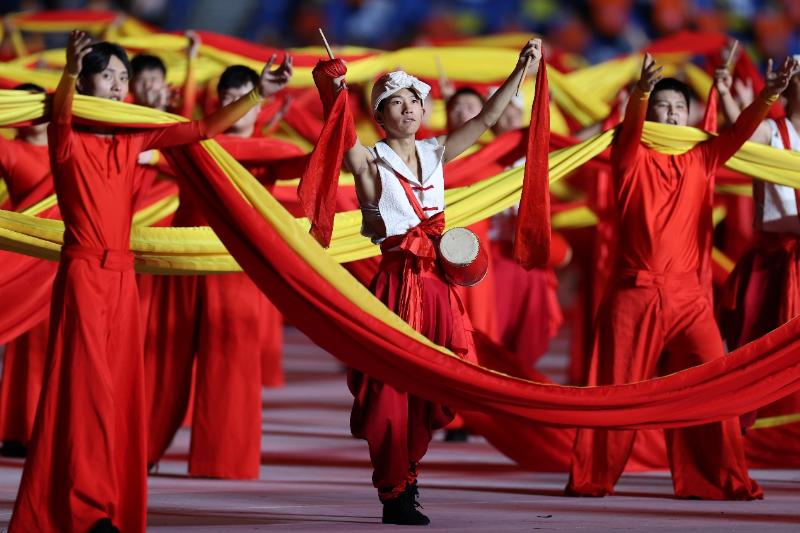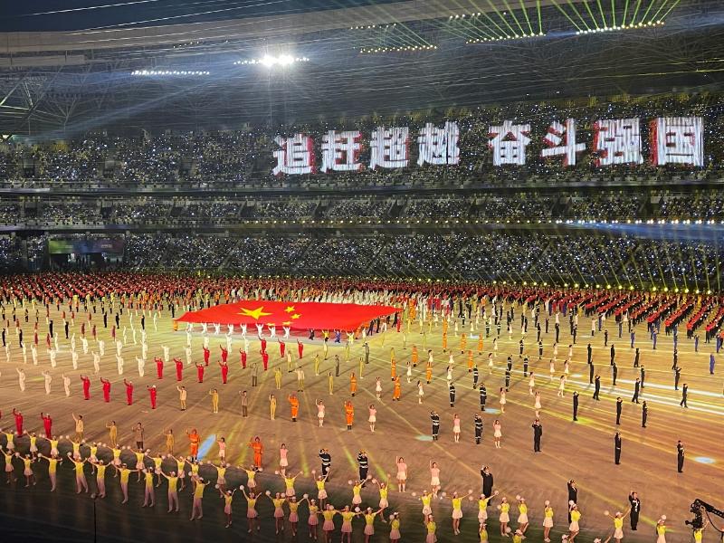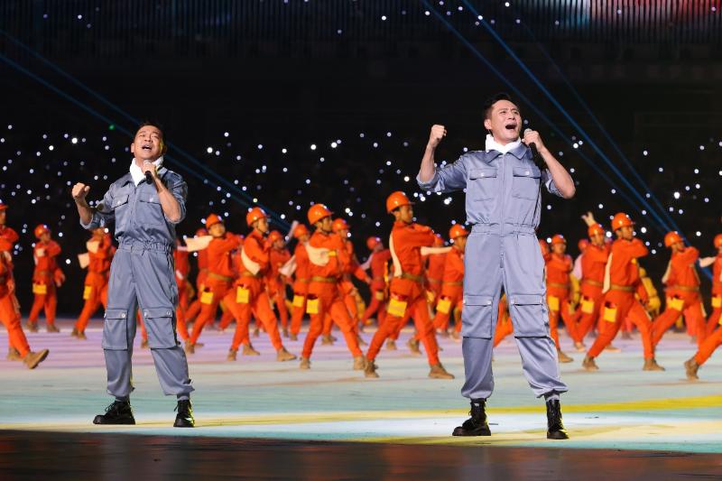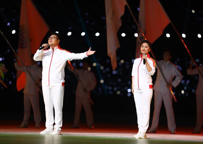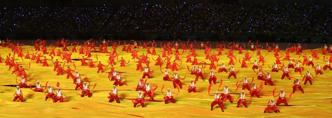 在陕西籍著名歌手周澎、郝萌演唱本届全运会会歌《追着未来出发》后,全运会开幕式正式进入《奋斗新时代 奋进新征程》文体展演环节。