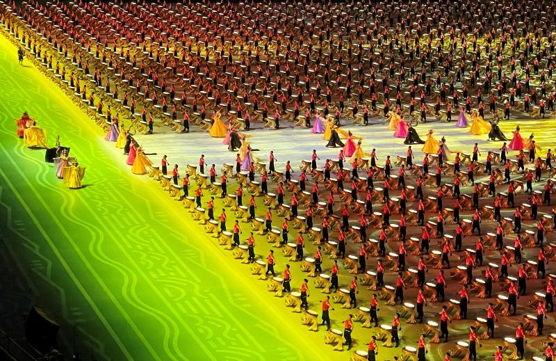 体育承载着国家强盛、民族振兴的梦想。激光与投影形成波浪,如同体育精神的时代脉搏。体育活动中一张张绽放的笑脸,一个个矫健的身姿,正是新时代中国人幸福生活的生动写照。广场舞、太极拳、啦啦操、竞速自行车、花式篮球、轮滑、街舞演员涌入场内,从全民健身到健康中国,从体育大国到体育强国,竞技体育和群众体育相得益彰。