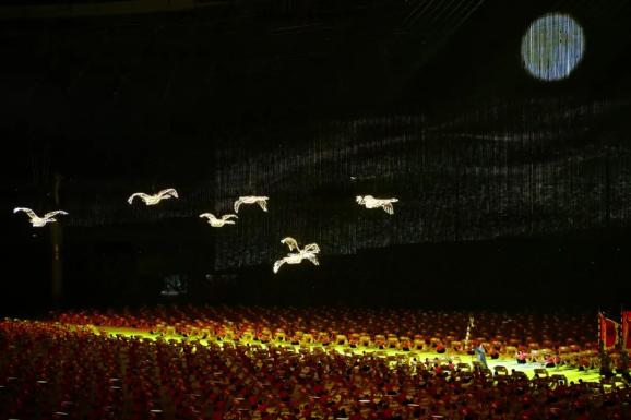 空中线幕与地面投影呈现大漠长河丝路全景,一行发光的大雁翱翔空中,“张骞”身着汉服,手持旌节阔步前行。这条积淀了“和平合作、开放包容、互学互鉴、互利共赢”精神的丝路,绵亘万里,延续千年,一直走到今天,成为了“一带一路”倡议的恢弘序曲。之后,广袖唐舞舞出大唐开放包容万千气象,风韵悠长。
