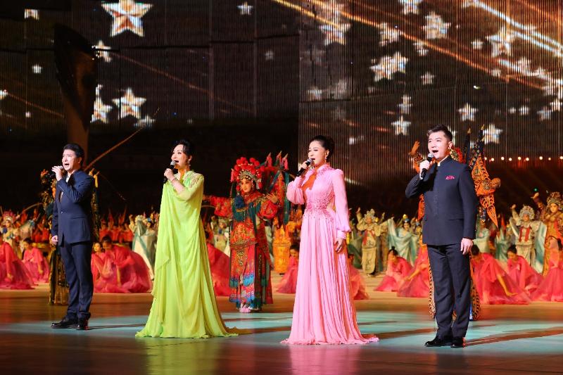 扎着传统大靠和经过艺术抽象创新设计的三米高大靠的秦腔演员鱼贯而入。千人秦腔吼出秦人雄魂,更吼出中华民族血脉不断,中华文明源远流长。四位中国戏剧梅花奖获得者联袂唱响原创新秦腔,唱出民族根根深叶茂,民族魂历久弥新。中华文明生生不息,中华文化辉煌璀璨,灿烂历史、照亮未来、影响世界!